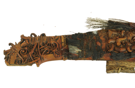 Set of two very nice mandaus from the App Kajan area in Borneo. one with wooden handle , then other with antler handle. Both very complete with colored hair tufts and fine carved scabbards. Blades are simple, one complete with side knife.