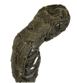 A hilt with a mysterious expression due to the hollow eyes. Very old used patina.
