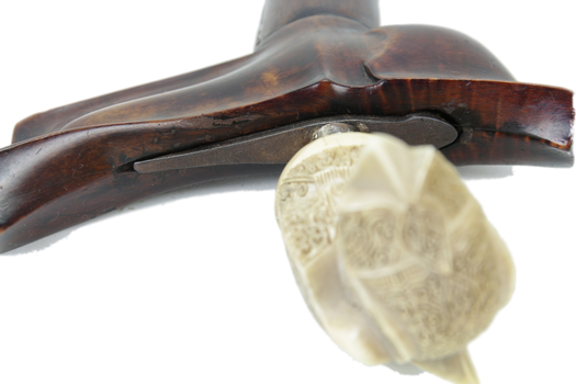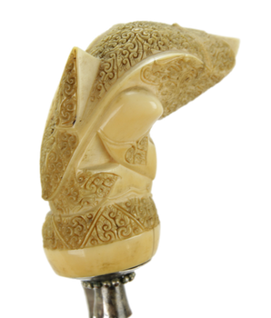 Classic keris from South Sumatra with big very fine detailed ivory handle. The selut of silver , harwood scabbard and added pamor blade what fits quite good. Tiny damage at top of wranka.