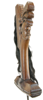 Extremely rare kampilan with wooden handle carved by a master carver. The very fine detailed helmet head in a style that has some relation with the Dutch late 16 century flintlock pistols. ( see example) .