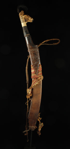 This example still has his original scabbard complete with textile strap , tassels and toggle.