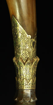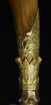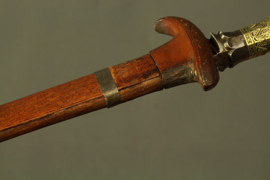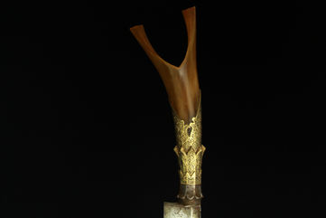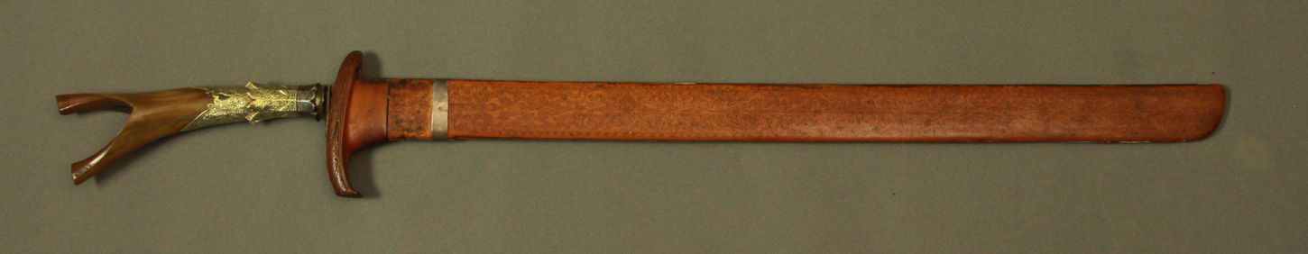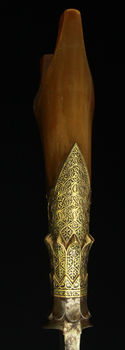 Very luxury sikin with a superb fine detailed elongated gold crown. For the horn grip they used the scarce horn of a albino waterbuffalo. The blade of very fine high quality damast, probably imported.