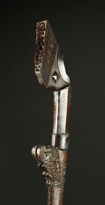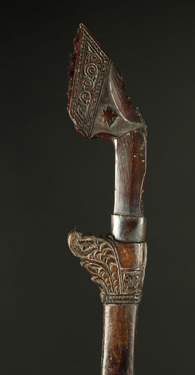 Horn hilt with carved details and remains of dyed goat hair.